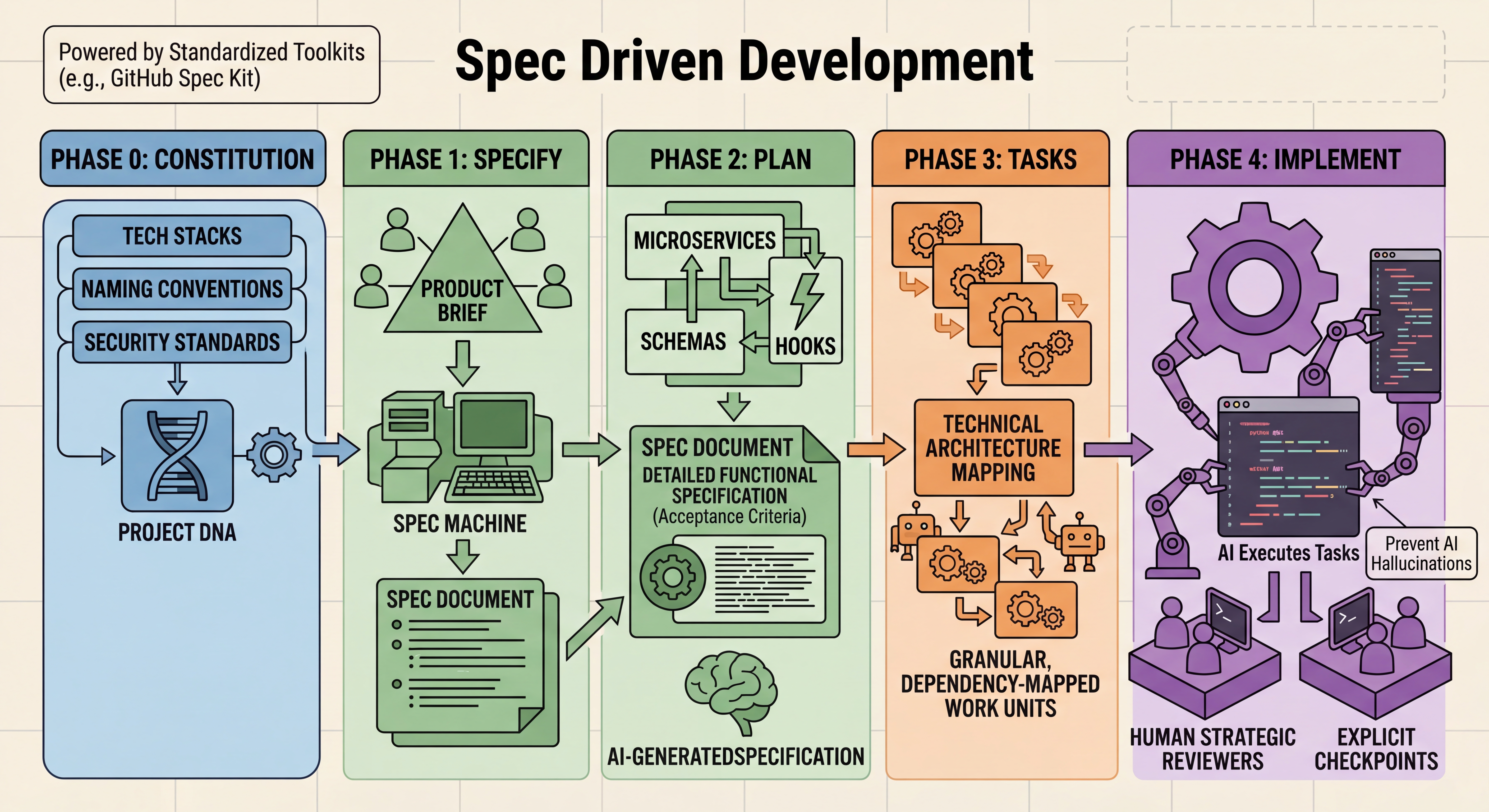 Standardized toolkits like the GitHub Spec Kit break development into five distinct phases:
